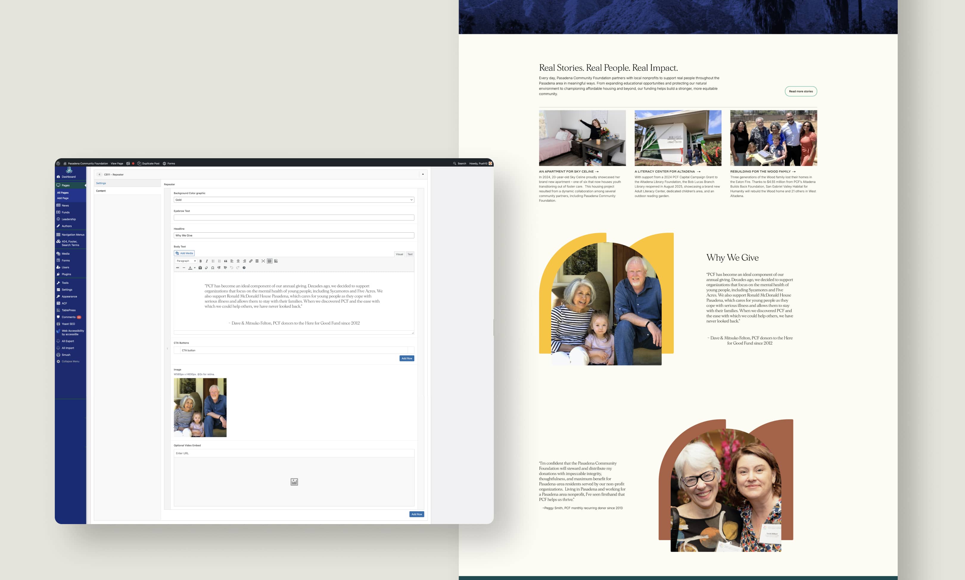 Despite decades of deep community engagement, PCF’s brand and digital presence weren’t reflecting its leadership or the true value of local philanthropy. The existing experience made it harder for donors to see impact, for nonprofits and advisors to find resources, and for stakeholders to understand PCF’s role in advancing Greater Pasadena.